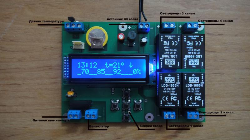 Контроллер имеет 4 независимых канала с возможностью управления яркостью светодиодов от 1-100% с шагом 1% (ШИМ16бит~ 770 Гц) для наиболее точной установки значений интенсивности светового потока. В контроллере реализована возможность подключения вентилятора и датчика температуры. Т.е при достижении температуры (устанавливается пользователем) верхнего предела включается вентилятор при уменьшении температуры до нормальных значений (устанавливается пользователем) вентилятор отключается. Также реализован режим теста, когда за полторы минуты проходит весь цикл запрограммированных параметров яркости светодиодов в программе за сутки. Видео теста можно посмотреть по ссылке ниже.