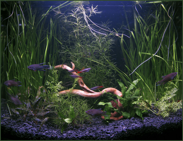 Вот наконец могу выложить фото с более приемлемым качеством. Фотографировать только учусь. Это макроподник, запустила два дня назад. Свет поставила Aqua Glo - отсюда такие несовсем естественные цвета - но выглядит эффектно. Корни лимнобиума, мне кажется, портят картину. Хочу добавить еще пару штучек данио полосатых. И вроде бы не хватает чего-то желтенького  . Мне интересны любые взгляды по поводу оформления.