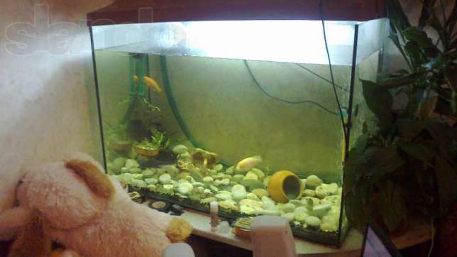 К аквариум в придачу идет обогрев (рассчитан на банку до 500 л), камни, грунт, декорации., лекарства для рыб и воды, улитки