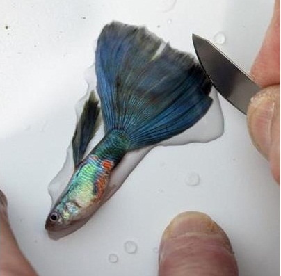 Bo.Br., Сложно несогласиться с Вашими доводами . Да , температура человеческого тела 36,6 градусов и если брать рыбу сухой рукой , она получает некоторый "ожег" слизистой . При некоторых навыках обрезка ножницами с зафиксированной рыбой в мокрой руке , не такое уж шокирующее для рыбы дело . Рука опускается в ведерко , она влажная и температурного шока слизистая рыбы не испытывает - если , повторюсь , данная операция отработана и проводится быстро . На мой взгляд при укладывании рыбы в влажную вату , рыба испытывает не меньший , если не больший стресс . На фото подравнивание хвоста с помощью скальпеля . При некоторых навыках подрезки ножницами край хвоста получается ровный . Конечно ножницы должны быть идеально острые и резать без "заминов" . Острота проверяется мокрой газетой - ножницами режут мокрую газету . Мои ножницы на фото 2 . Далее я включил цитаты /фото 3,4/ извесных практиков-селекционеров гуппи В.В.Сторожева и К.А.Перова . Причем замечу , что они лезвиями не пользуются , как и ножницами . Я согдасен с Вами , о подрезке используя лезвия безопасной бритвы , хотя "переучился" и мне теперь удобней резать ножницами - это субъективно ... Просто мне кажется надо знать большинство приемов и способов , а какие применять каждый любитель гуппи выбирает для себя сам .