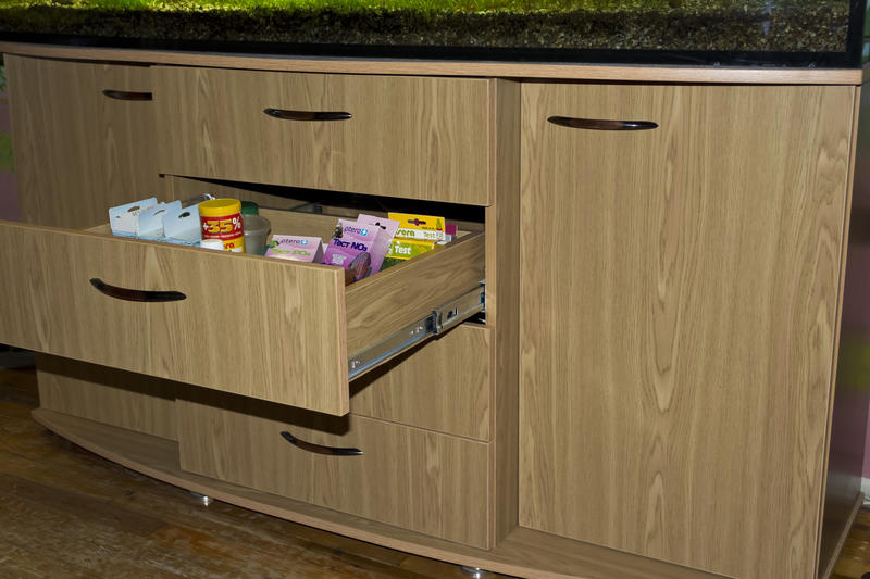 аквариум по уровню если пол недостаточно ровный. Левый отсек тумбы имеет выдвижную полку для облегчения обслуживания