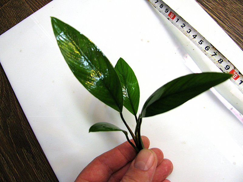В условиях теплицы довольно крупное растение, под водой меньше, но тоже не малыш, 50 см для него не проблема. очень часто выпускает листья на воздух из аквариумов 50 см глубины, смотрится очень эффектно. Пожалуй анубиас с самым большим цветком, у меня были початки 12 - 13 см длинной.
