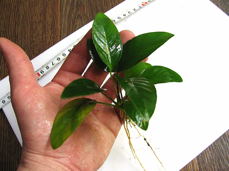 Крупный, интересный анубиас, с большим крепким листом, способен жить под водой.