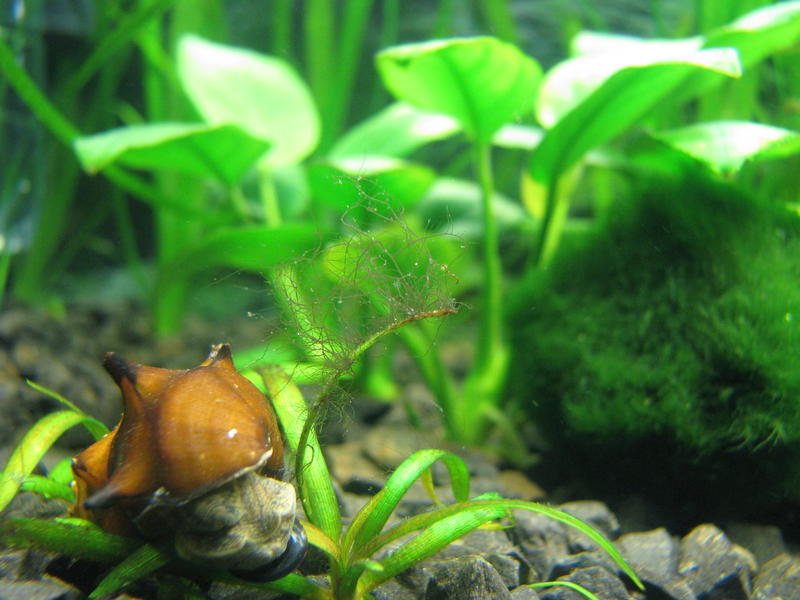 З'явилися водорості. Зелені нитчасті поборов без проблем затемненням на два дні. Зараз же якісь бурі волосинки на багатьох рослинах, бурий наліт на деяких рослинах, чорний наліт на кінчиках листя анубіаса нана, а також сьогодні помінив зелений наліт на склі.