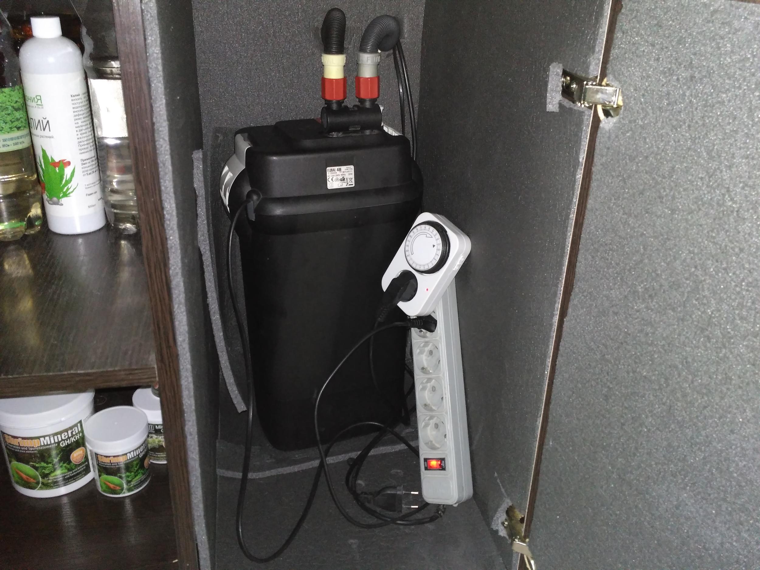 ДСП, усиленные ноги. Делалась под заказ. Отсек для внешнего фильтра обесшумлен.