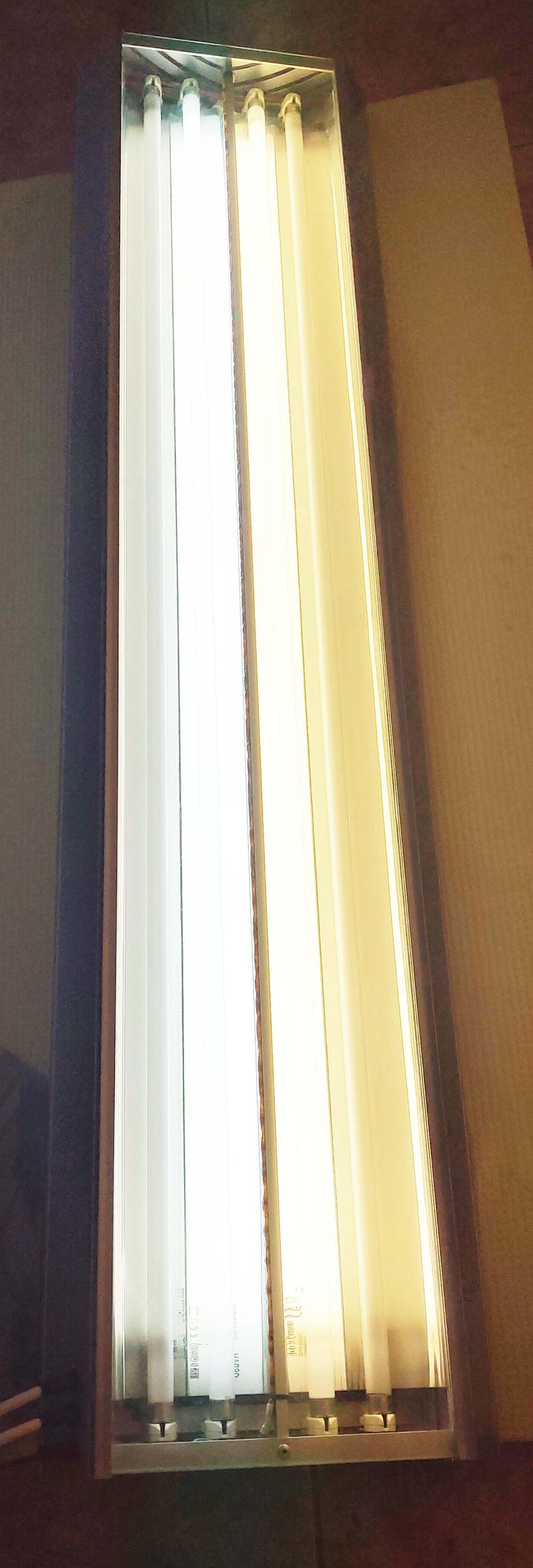 Четыре лампы Т5 по 54Вт с отражателями (2 эпра). Лампы защищены стеклом. Освещение разделено на 2 + 2 лампы, что позволяет с утра включать 50% освещения, днем 100% и вечером 50%.