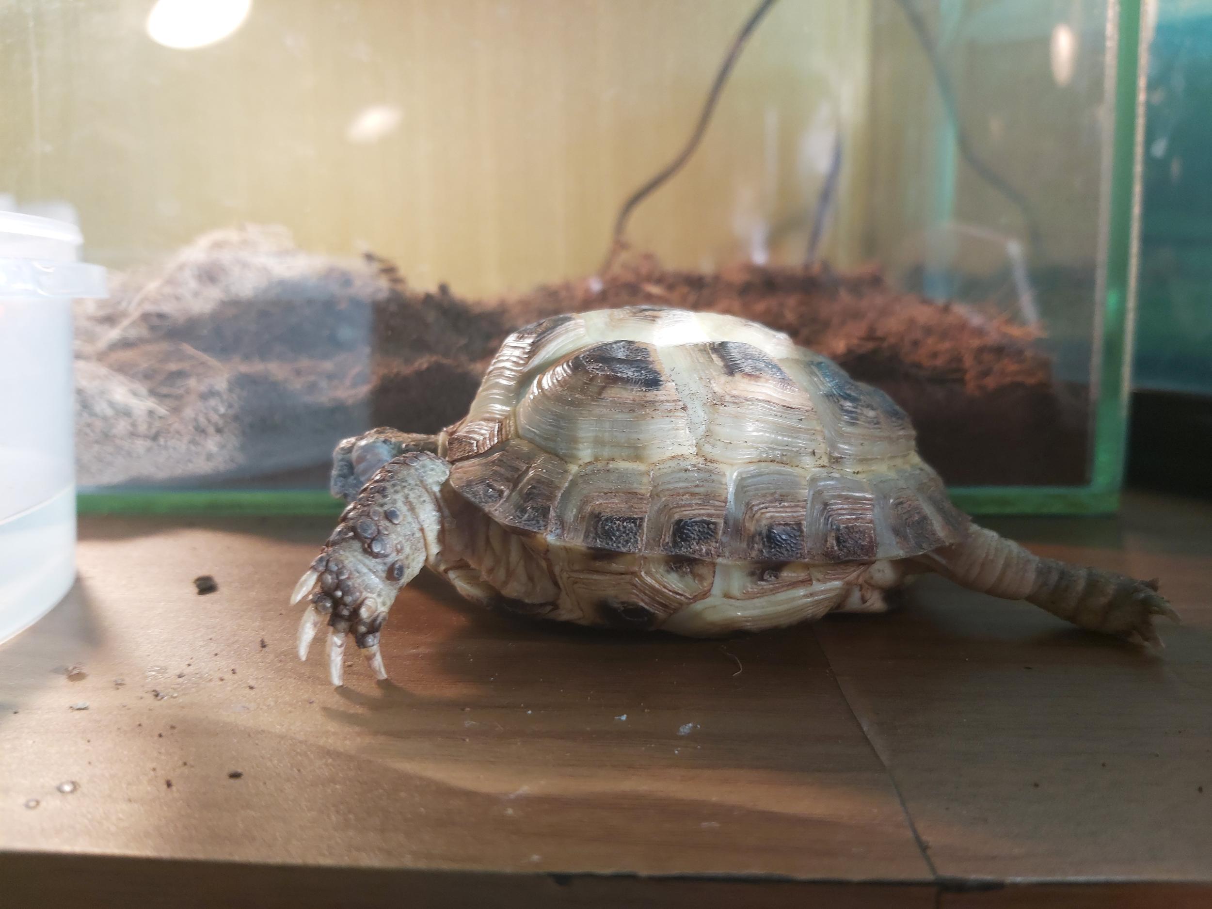 День добрый! Пишу вот с таким вопросом: после того, как мы разбудили черепаху после спячки она никак не откроет глаза. Причём она продолжает ходить-бродить и делает это с закрытыми глазами. На гиповитаминоз и на конъюнктивит не похоже по симптомам. На форуме видел похожую ситуацию и там говорилось, что черепаха просто обезвожена. Будили в пятницу ( дня 3 назад ) и все эти дни активно купали и промачивали глазки водой и глазными средствами ( с чувством меры, чтобы не было перебора, а то мало ли ). На данный момент немного открывает левый глаз. Содержится в типа террариуме ( стеклянная конструкция ). Стоят 2 лампы: УФ и нагревающая. В качестве подстилки лежит кокосовый грунт. Прикладываю фото тортилы со всех ракурсов. Мне нужно знать, болезнь ли это или простое обезвоживание после спячки? Как и чем возвращать тортилу к обычной жизни?