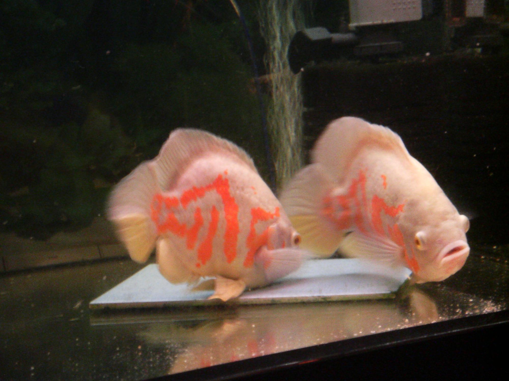 Запорожье.В связи с приобретением новых видов продам две нерестовые пары Астронотусов. Фото 1 Пара тигры альбиносы 3 года. фото 2 пара самка ред альбино самец тигр альбинос.