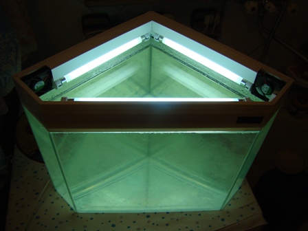 Крышка из пластиковой вагонки и цианопана.Свет т5 6+6+8 ватт на основе китайских светильников.Лампы:2 по 6 ватт-филипс 765,8 ватт-сильвания гролюкс.Охлаждение 2 кулера 5*5 запитаных от зарядки мобильника.
