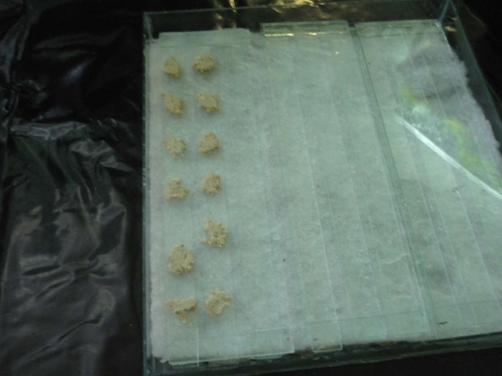 Сверху полосы накрываем кусками стекол, всего у меня вышло три стекла, каждое стекло накрывает три полосы с кормом, к каждому стеклу по краям наклеены полосы, шириной 1,5-2см. (фото 5). Корм находится немного в приплюснутом состоянии между нижними стеклянными полосками и верхним стеклом (фото 6). Это дает свободно перемещаться червю по верхнему стеклу, с которого его потом легко собрать.