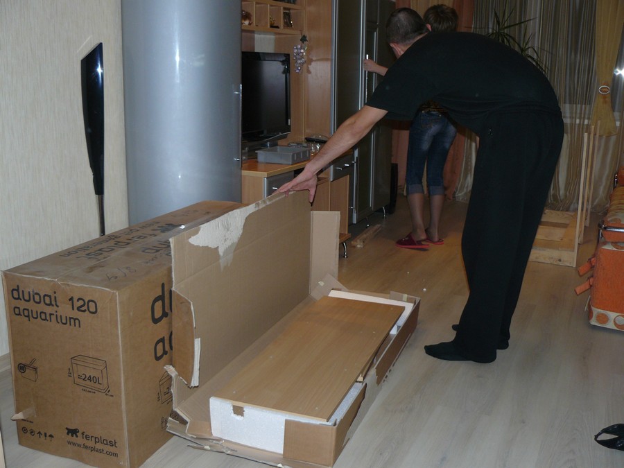 В перерывах между делом было выпита бутылка виски и два литра пива. Не смотря на это, тумбу собрали и аквариум установили.