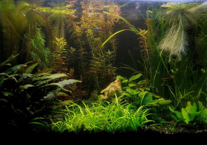 Растения: эхинодорус горизонтальный пару кустиков, валлиснерия обычная, сагитария, эхинодорус травянистый и четырехребристый, ситняг, погостемон, линдерния, прозерпинака , дидиплис, роталла индийская, криптокорина Вендта Браун, перистолистник красностебельный, хемиантус микрантемоидес на корягу примотал анубиас, пару видов мха(яванец и фиссиденс) и рикардию, пистия