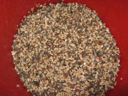 С виду похоже на кирамические отходы, кусочки бежевые похожи на глину есть с белым,синим,салатовым и т.д. И есть природные породы. Все камни гладкие.