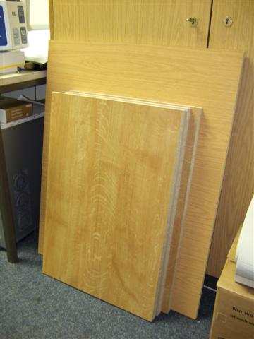 Далее буду описывать порядок сборки. Для начала верхняя и нижняя плиты. Они покрыты пленкой только сверху и немного снизу. БОльшая часть нижней поверхости - бумага, поэтому как торцы так и поверхность с бумагой надо обработать лаком. Перед лакировкой небольшим куском наждачки зачищаем острые кромки плит от небольших остатков распиловки (опилок, и неровностей бумаги). Лак оставляю на завтра. На сегодня этим закончу.