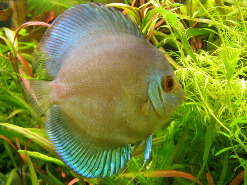 Два взрослых дискуса - самка "Blue diamond" (ок. 12 см с хвостом) и, предположительно, самец то ли "Cobalt", то ли помесь Blue diamond с кем-то (ок. 9-10 см с хвостом), хотя покупал малышом как "b. diamond". Рыбе более двух лет.