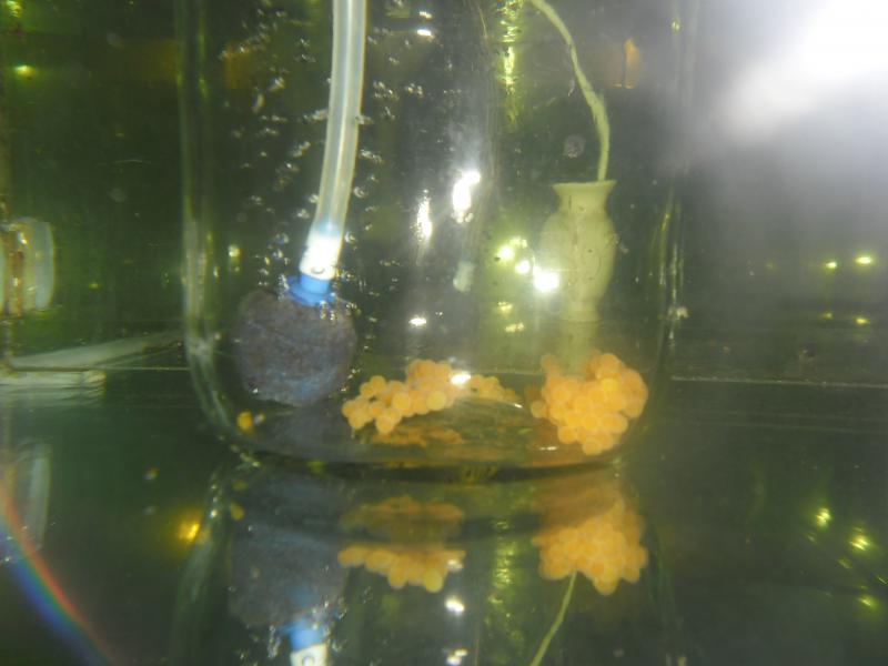 Вот так можно инкубировать икру сомов: поллитровая банка на дне аквариума, внутрь в банку вставлен распылитель. Примитивно, но эффективно.