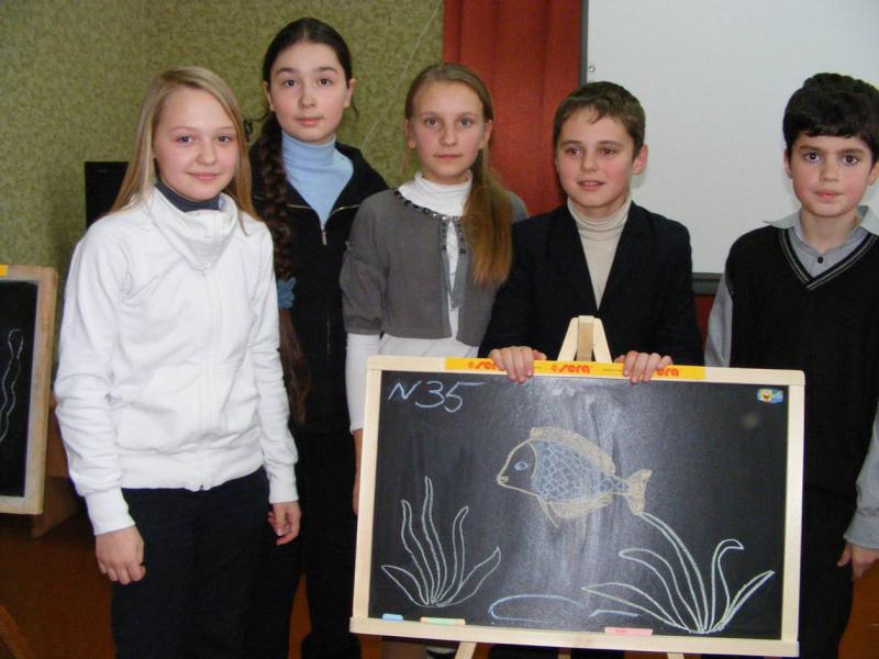 Кратко о самом конкурсе . Из групп поддержки , которые пришли поддержать свои команды-конкурсанты на крнкурсе по оформлению аквариумов , были путём опроса на аквариумную тематику отобраны команды по 5 человек с каждой стороны . Задача команд-нарисовать аквариумную рыбку . Условие-каждый участник может подойти к мольберту только один раз и рисовать до тех пор,пока не оторвёт руку от мольберта . Как только рука от мольберта оторвана , его сменяет другой участник команды и продолжает неотрывая руки рисовать . И таким образом до последнего участника .