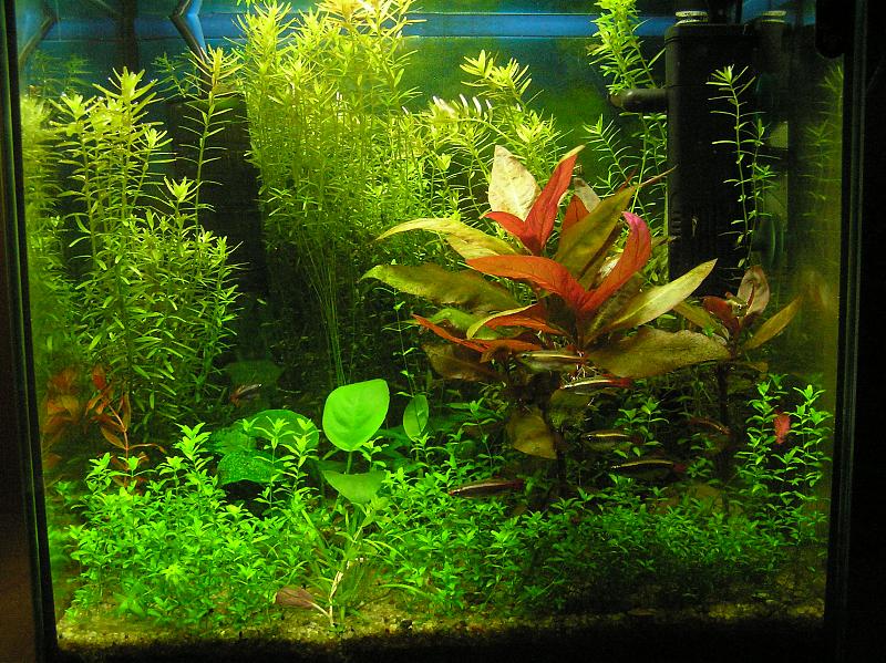 30 литров, тетра АкваАрт, штатный фильтр Кристал выкинул по причине зажевывания креветок, китайский Резун немного доработал, чтобы не совался по стеклу и таки ж фильтровал. Подача Со2 от бражки, системку описывал в проекте, удобрения Сера, по инструкции. Свет штатный и пока, к сожалению не придумал как его изменить. мало его - 0.4 вата на литр. Растения: гемиантус, роталла, анубиас, людвигия, папоротник, бликса японская, яванский мох и элеохарис. Рыбы: кардиналы, Прочая живность - мелании, катушки, теодоксусы, неокардины, борода черная.