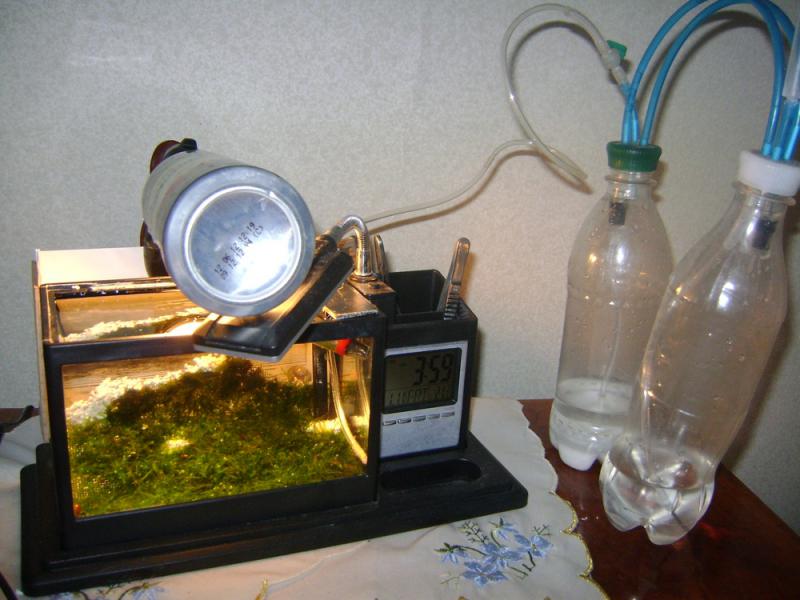 После этого, сделали свет (на нанике он традиционно слабый, поэтому в ход пошла пивная банка с лампочкой Ильича в 15 Вт- ИМХО самый удачный вариант спектра)) и подключили СО2. Естественно, "генератор Юрия-TPV". Правда, пришлось его немножко модернизировать, чтоб он выдавал 1 пузырь в 30 секунд- больше для такого объема мне было не нужно