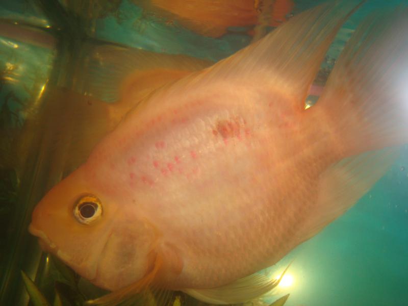 Подскажите пожалуйста , что могло случиться с попугаем!! Было все отлично , но вдруг заметила какое то пятно на одной из рыбок. Эта рыбка с самого рождения была другого цвета, цвет пропал со временем, остались лишь маленькие точки от цвета.Но я заметила что появилось какое то пятно. Сегодня увидела что рыбка плавает ближе к верху. Прошу прощение за фото , ну так получилось. Сама рыбка стала немного бледнее. аквариум 170 литров. Сделала все тесты на воду, все в норме. Подмену воды и чистку делаю 1 раз в 7-10 дней. меняю 40 литров где то. Корм тетрамин - давно - не меняла, единственное что, 7 дней назад купила две скалярки в мою компанию , но пятно на попуге было уже до скалярок. вроде вечером эта рыбка от еды отказалась , утром ела , да и поведение было как обычно!! Да, еще заметила что рыба начала этим боком тереться о предметы