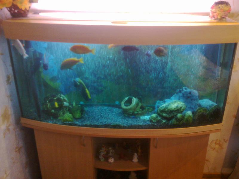 Продам аквариум линзу на 255 л с оборудованием и рыбами. Размер банки 1,2*0,4*0,55м. Фильтр выносной Fluval 306 (куплен 6 месяцев назад). Крышка с лампами Т8, 2 шт. по 20 Вт. Компрессор. Цихлиды крупные. Фото прилагается. Цена за все 3000 грн. 050-209-57-01 Игорь