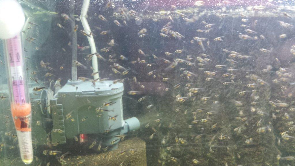 Малыши растут хорошо. Могу заметить, что соседство с креветосами и ампуляриями идёт на пользу - они подъедают то, что не съела малышня. Корм по-прежнему - разные фирменные сухари и заморозка пыли. Купленные нематоды и энхитреус (культуры) себя не оправдали - не растут. Деньги на ветер. Буду и дальше кормить фирменными сухарями. Планирую измельчить на кофемолке тетра дискус и добавить в рацион. Декапсулированные яйца артемии тоже идут "на ура!". Из новостей - вчера на день влюбленных та же пара опять дала кладку, пришлось срочно готовить новый инкубатор. А ещё очень хочу получить приплод от пары рэдов. Ну и фото на додачу.