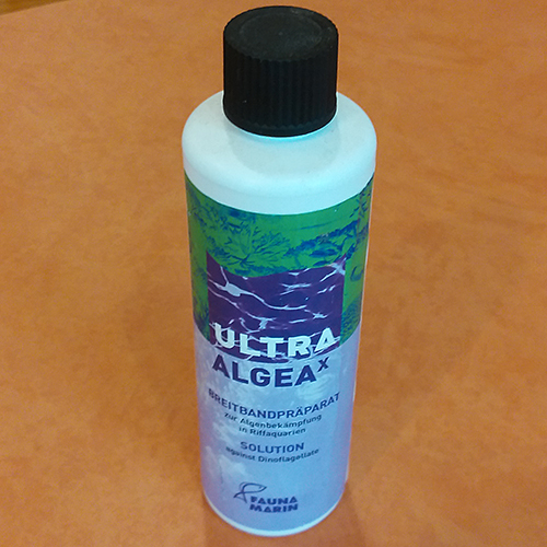 Препарат для борьбы с водорослями Fauna marin ultra algea x 250 мл. Почти полная бутылка, всего пару раз линул этот препарат, а потом мне подсказали как избавиться от водорослей без него. Оказалось достаточно было просто переложить камень с водорослями в низ, потому что в верху зебрасома боялась объедать тот камень. И через неделю камень был чист.