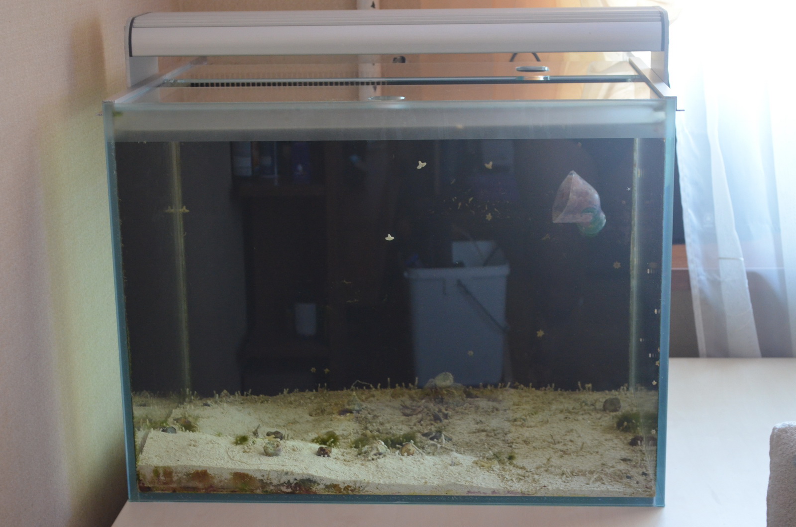 Первую неделю продажи держу банку запущенной, живой песок дарю покупателю. Если не продастся, то спускаю воду, чищу и продаю уже в сухом виде без песка. Даю возможность выбрать нужную комплектацию покупателю аквариума, всё комплектую по потребности, порядок цен: