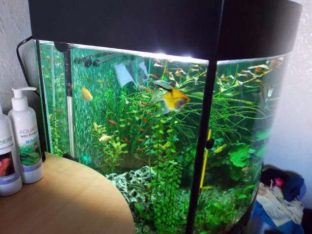 Аквариум на 200 литров с тумбой. Полностью укомплектован. Крышка ручной работы, в нее вмонтировано два кулера (летом спасает рыбок от жары), две лампы AquaLighter 2(60см). Крышка изготовлена из алюминиевого листа толщиной 5 мм. спокойно выдерживает 20 л. ведро с водой, удобно при замене воды. Фильтр JBL CristalProfi greenline e 901, два обогревателя, система СО2 полный комплект, таймер для автоматического включения и отключения освещения.