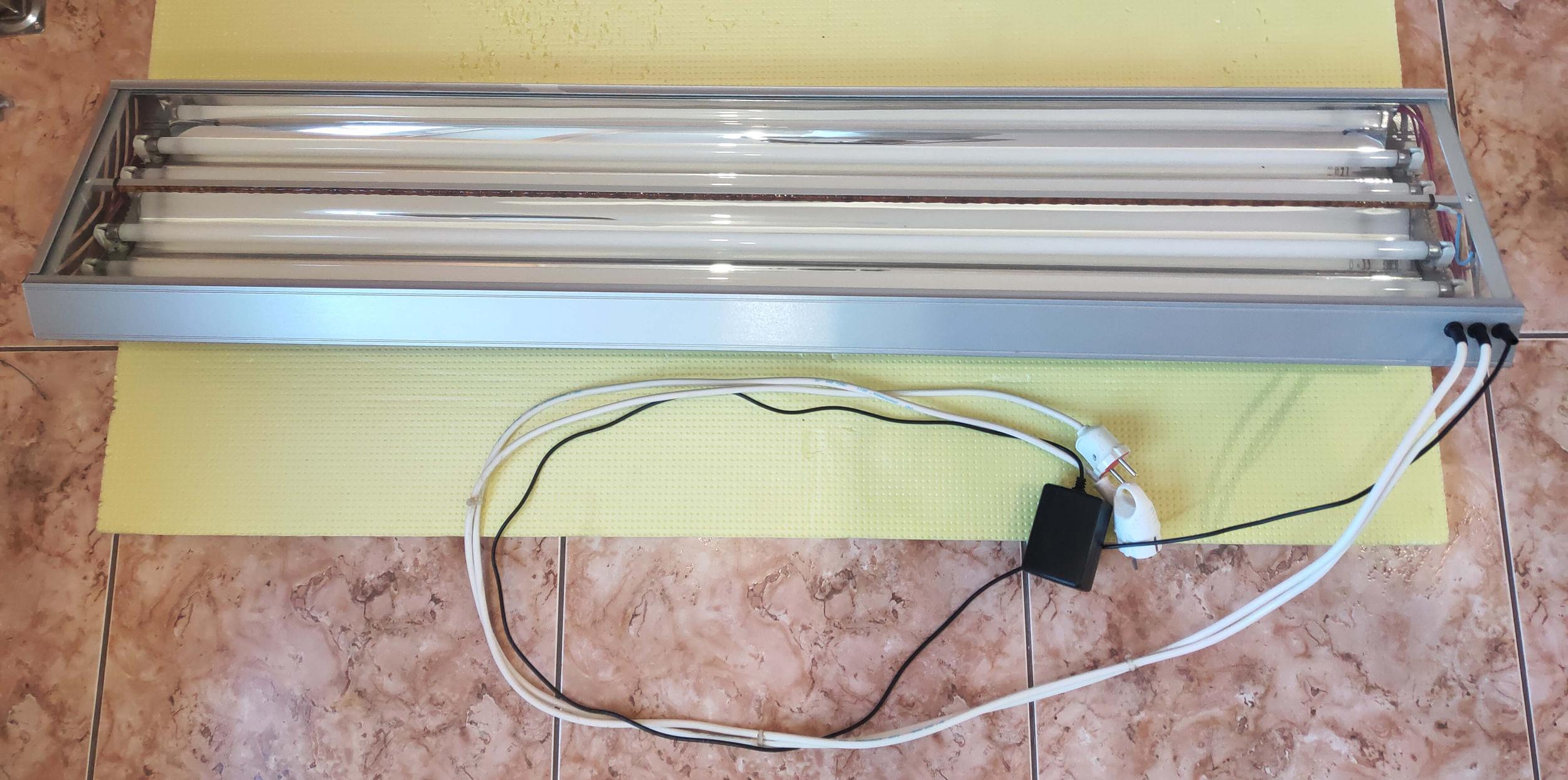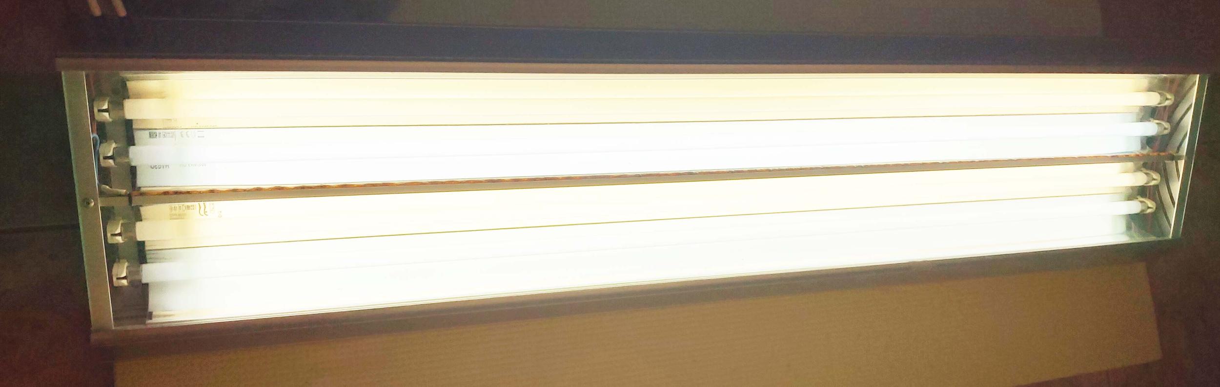 Четыре лампы Т5 по 54Вт с отражателями (2 эпра). Лампы защищены стеклом. Освещение разделено на 2 + 2 лампы, что позволяет с утра включать 50% освещения, днем 100% и вечером 50%.