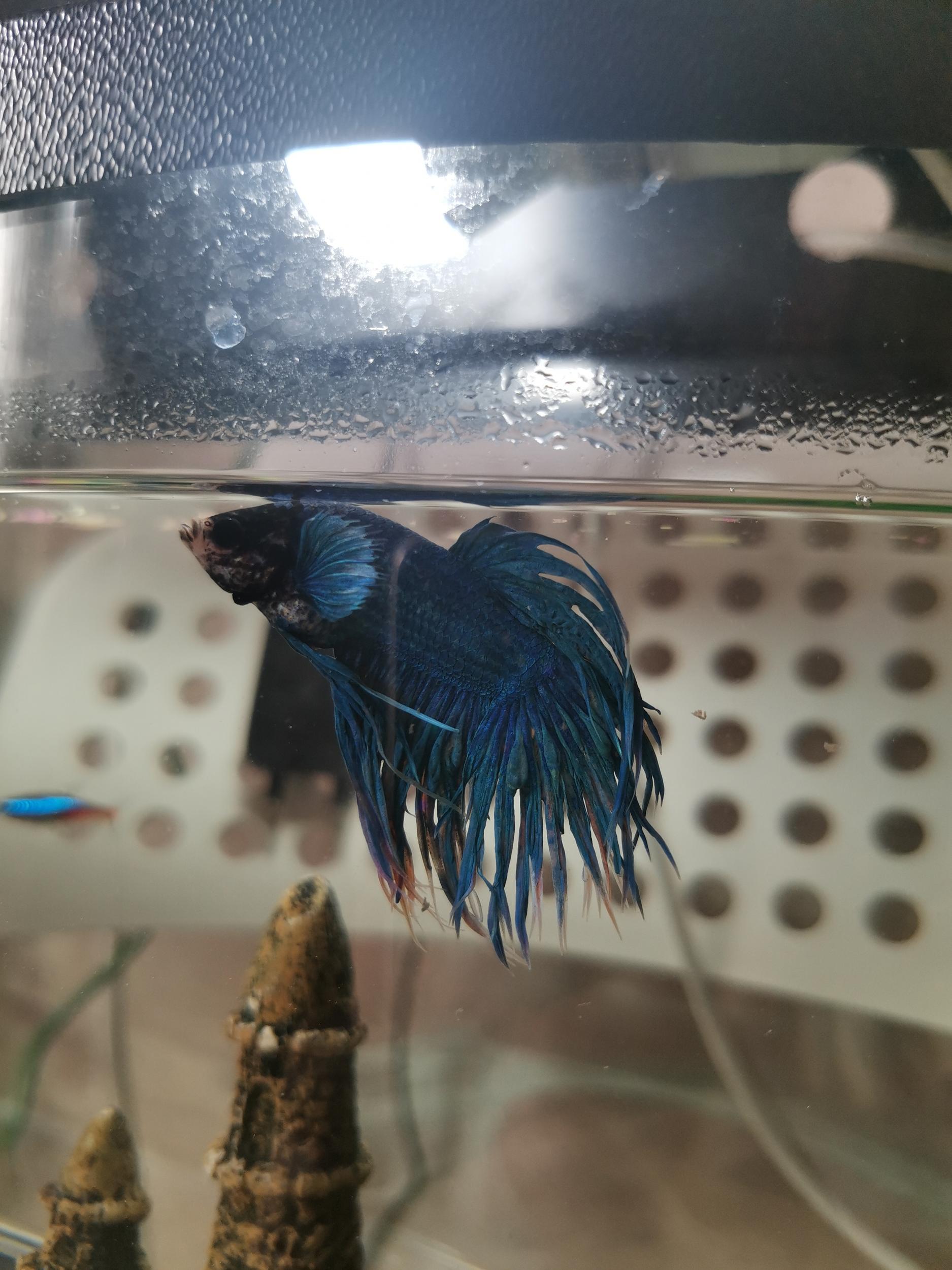 Состояние петушка обычное, ничего не изменилось. Кушает обычно. Плавает и играет с неоном. Отдыхать уходит в домик.