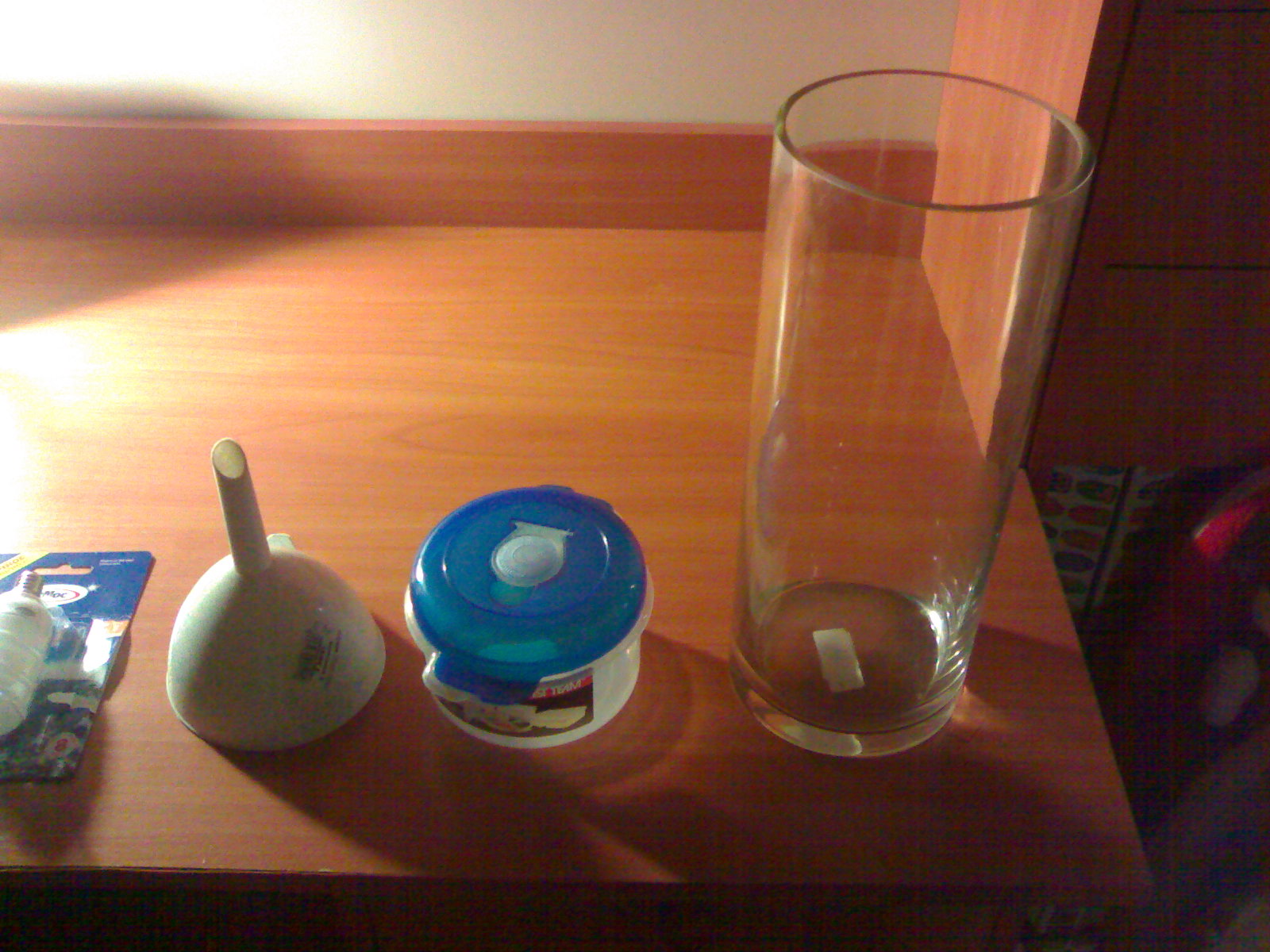 После покупки ваза заняла почетное место наверху книжного шкафа, в виду того, что надо было продумать устройство крышки с освещением, другого оборудования. Обдумывание заняло порядка недели, в результате были сделаны выводы: крышка должна быть легкой для устойчивости, крепиться жестко, иметь отражатель в виду высоты столба воды. Выбор материала был сделан в пользу пластмассы. Вооружившись рулеткой, которой были предварительно замерены диаметры вазы, начались походы по магазинам, супермаркетам в отделы освещения, посуды. В результате был приобретен пластиковый контейнер для продуктов, пластиковая лейка. По размеру контейнер должен был входить в вазу, лейка соответственно в контейнер. Радости и удивлению не было предела, когда контейнер стал в вазу тютелька в тютельку – видимо их делают либо на одном заводе, либо специально под размер друг друга.
