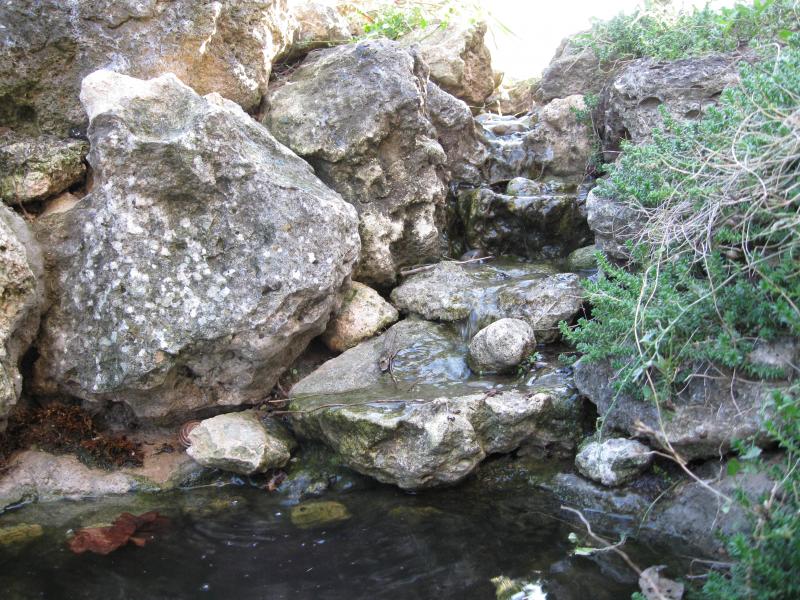 С большого водоема вода вытекает аккуратным ручейком,проходит под тропинкой,и ввиде водопада попадает в маленький водоемчик,оттуда ручей уходит в сад...