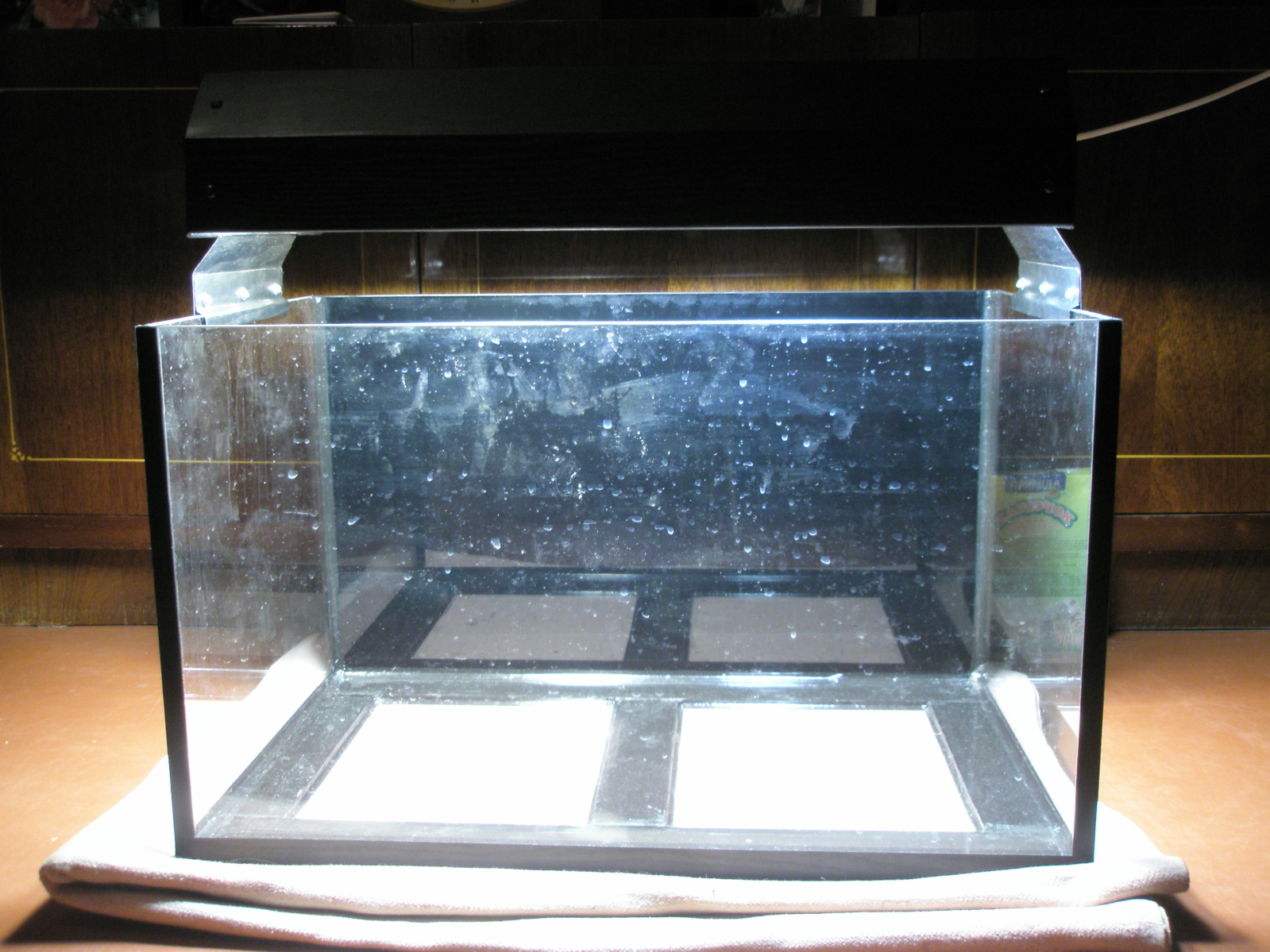 Захотел я себе новый аквариум, но делать закрытую крышку мне не хотело, а хотелось чегото открытого, подвес или светильник на ножках. Посидев часок с карандашем, я начертил чертежик по которому начал делать светильник. Сделал я его из оцынкованого листа жерсти, что в свою очередь отразилось на очень малов весе светильника, также я сделал съемными ножки для того чтоб в любой момент его можно было подвесить. Отражатели я сделал параболические тоже из цынка обклееного алюминиевой зеркальной пленкой, а чтоб алюминий не начал со временем окислятся я покрыл прозрачной самоклеющей пленкой, а сам светильник обклеил черной самоклейкой. Лампы я использовал экономки 4шт 2 по32вата 4200к и 2 по 18ват 2700к так как результатом излучаемого света я доволен, по эксплуатации другого травника. Вот собственно фото светильника.