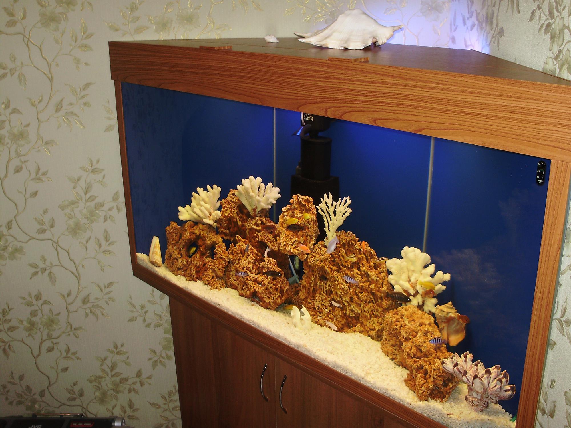 Уважаемые аквариумисты! хочу поделится с Вами историей приобретения своего первого аквариума. Однажды мне по работе пришлось оказаться у начальника дома и там я увидел свою мечту и своё будущее хобби - у него был травник примерно литров на 100-150 с неончиками и другими рыбками... Заболев мечтой приобретения аквариума я начал шерстить inet и после недолгих странствий попал на aquaforum. И тут благодаря Вашим стараниям я нашёл ответы на весь список своих множественных вопросов. По свободному углу в комнате аквариуму суждено было стать угловым или почти угловым, придумав чертёж и узнав адреса самоделок в городе я пару месяцев поднакапливал финансы и втайне от своих домашних сделал заказ. Пока клеился мой аквариум я в новом Эпицентре приобрел рифовый камень, на местном рынке коралы и ракушки, грунт - белые катаные камушки фракцией 2-5мм, фильтр решил ставить пока внутренний бюджетный вариант Aquael Turbo Filter 1100 (с подрастанием рыбок буду переходить на внешний Eheim) и дешовенький обогреватель Xilong 250 Вт., ж/к градусник Tetra. Компрессор выбирал по критериям - цена, качество, малошумность плюс отзывы и вышел на SHEGO IDEAL 150 л/ч с гибким распылителем HAGEN ELITE 58см. Всё выше перечисленное оборудование покупал в "Аква Мире". По совету самоделкина и удешевления аквы освещение вышло на энергосберигалках.