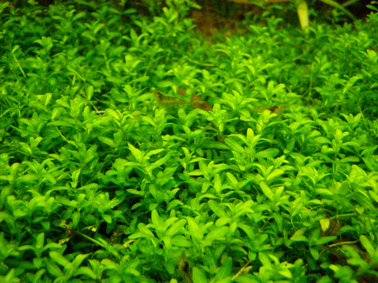 Разрослась почвопокровка - Хемиантус (Микрантеум микрантемоидес) - кстати вычитал, он аж трех видов - у меня тот, который образует на веточках только по два листика. (Есть вид, что образует по 2-3 листика в узле).