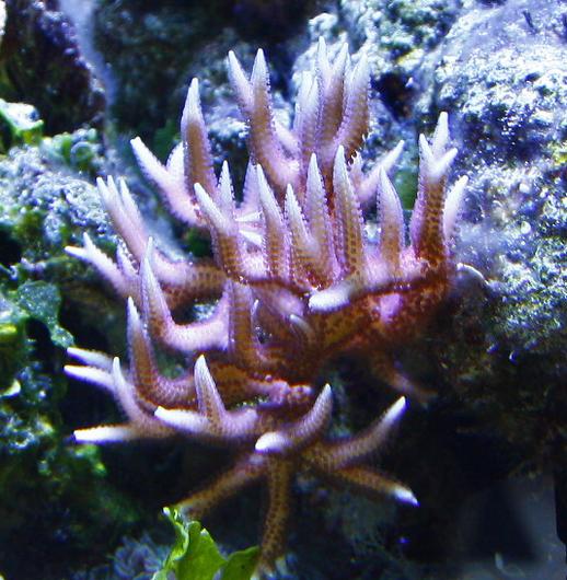 Вставлю свои пять копеек. Происхождение коралла тоже (фраг Стаса) фото не очень, октябрь прошлого года( то что в компе на работе нашел).Сейчас минимум в три раза больше а цвет темно насыщенный розовый.Освещение т5.