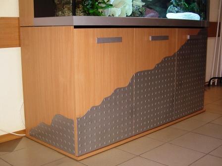 Можно аквариум ставить и на металлоконструкцию, а затем навешивать любые фасады. Вариантов используемых материалов очень много: МДФ, стекло, ДСП...
