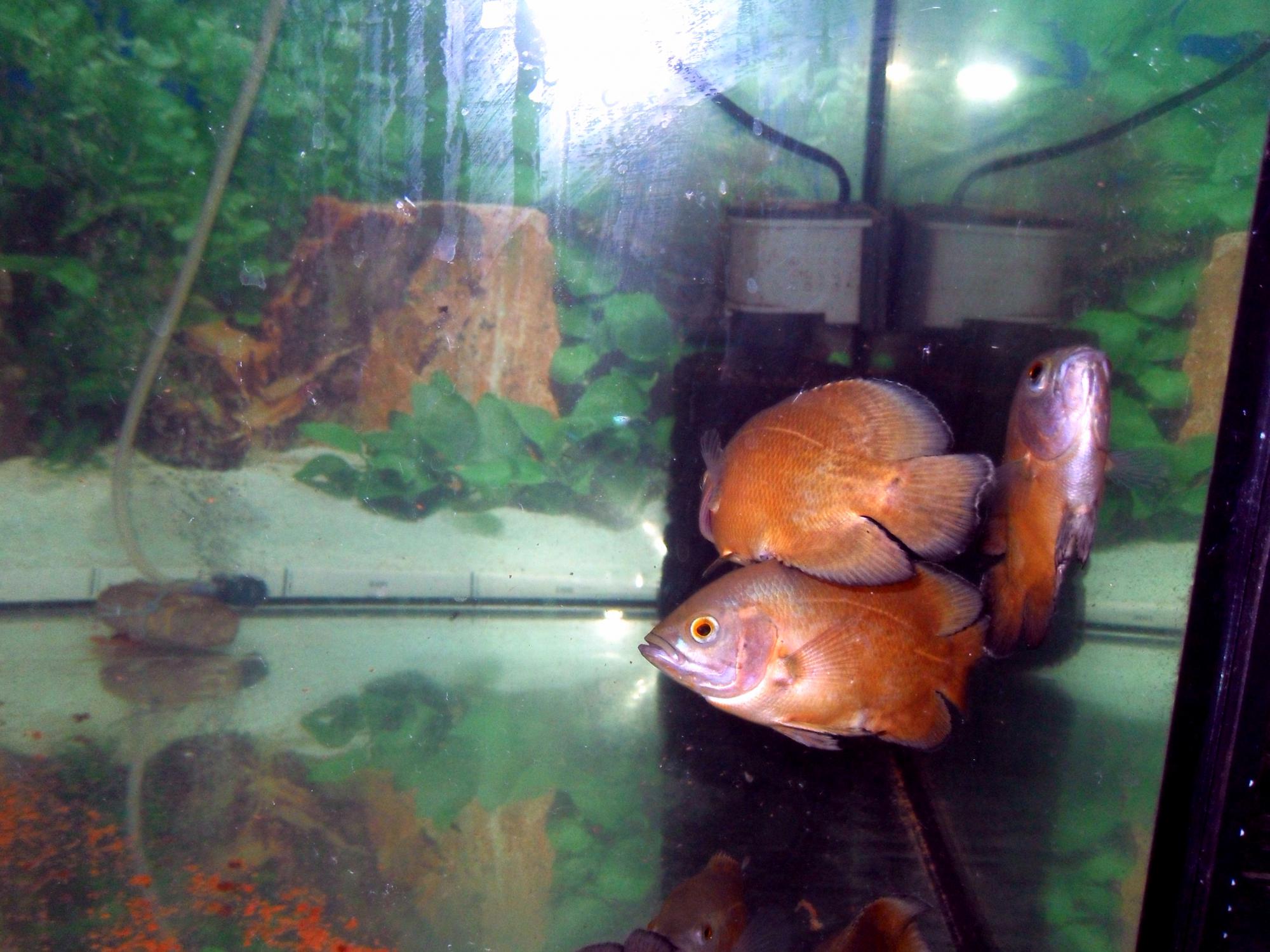 Население: Три Астра (Gold), уж и не знаю как точно обозвать  , в общем - апельсинового цвета (3 года - 30см) и новые "жители" - пара красных Оскаров (1,5 года - 25см). А также пара Плекостомусов (2-3 года - 30 см).