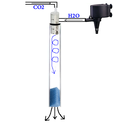 Надеюсь понятно по рис. но вкратце - в колбу поступает СО2, туде-же поток воды с помпы, получается каламбур пузырьков внутри, идет 100% растворения СО2, и уже насыщенная газом вода поступает в воду для наших растений.