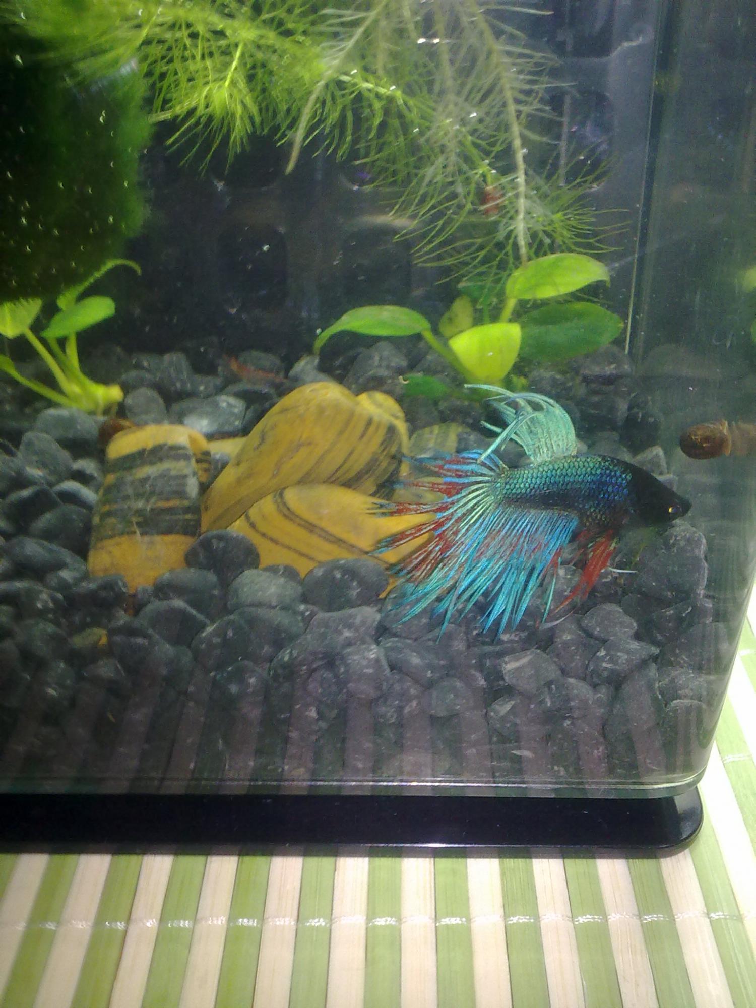 Доброй ночи. Сегодня решила выложить фото моего нового жителя 2 литрового аквика который живет у меня на работе и радует мой уставший глаз. Прошу любить и жаловать-Прохор. Красавец хоть куда,но живодет ещё тот. Привезла 3 черрика-первый погиб рзазу же-был перекушен пополам. Второй инвалид-мы его чуть-чуть покусали,а третий ещё сопротивляется. Думаю надолго его не хватит. Дизайн аквариума в процесе полета. Муза меня как-то не посещает. Может что-то посоветуете? Буду очень рада.