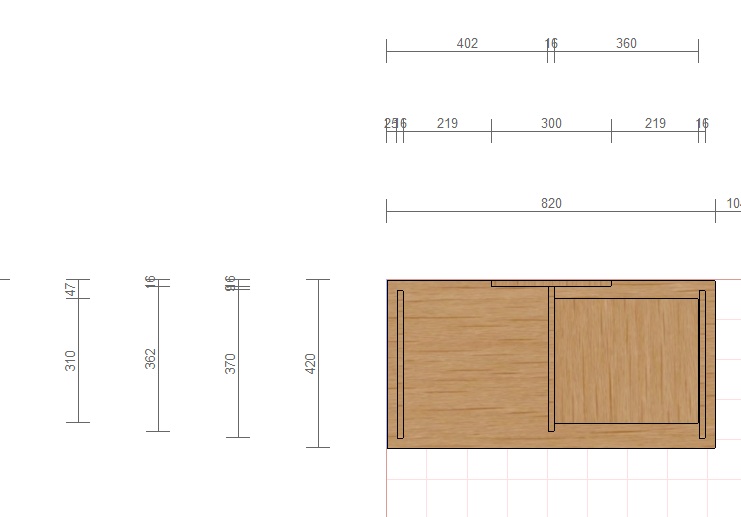 У меня польская тумба практически с вашего чертежа, дверка навешена справа. Кромка (край) дверки ложится на среднюю перегородку заподлицо, правда у меня крышка овал, под панорамное стекло, нависает впереди на 4-5 см - очень удобно - не видно зазоров дверки, и случайная вода стекает минуя елементы тумбы прямо на пол.