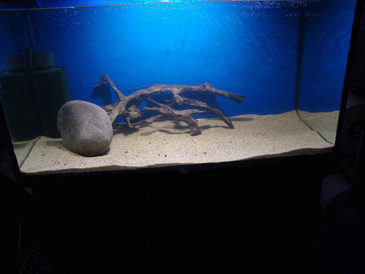 Несколько дней назад запустил новый аквариум 100*50*50 250литров планировался с малавийцами группы Мбуна, был насыпан грунт, положена коряга, декорации только камни, сегодня запустил первых рыб