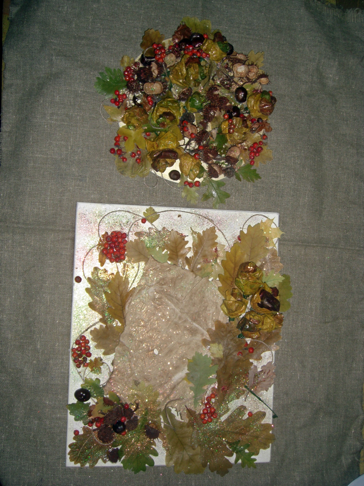 А всего лишь хотела доделать осеннюю тематику декора для детского садика. Использовала всё что собирали на прошлой неделе))) Осталось у Андрея Ostry забрать желуди и будет прямоугольнике панно доделано. Круглое - это декор на пластинке))