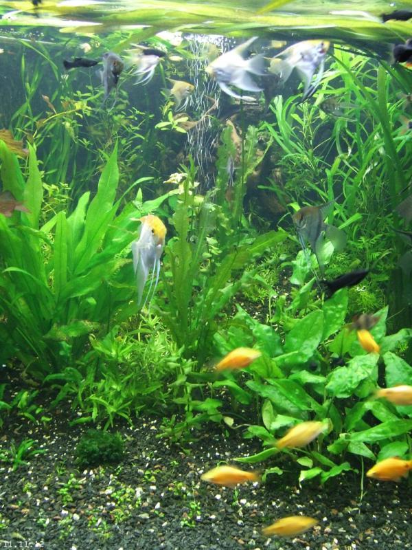 Так как перезагрузка у меня заняла почти две недели (еще и горячую воду отключили), то много растений погибло  а некоторые которые вы видите приходят в себя сейчас. Нимфея побрасывала листья, но выпустила много новых, некоторые эхи покрутили листья, но выпускают сейчас новые прямые листочки. Вобщем наращиваем сново массу растений. Рыбы так много (особенно скалярий) так как это рыба уже моего разведения, собираюсь тут на форуме раздавать/продавать.