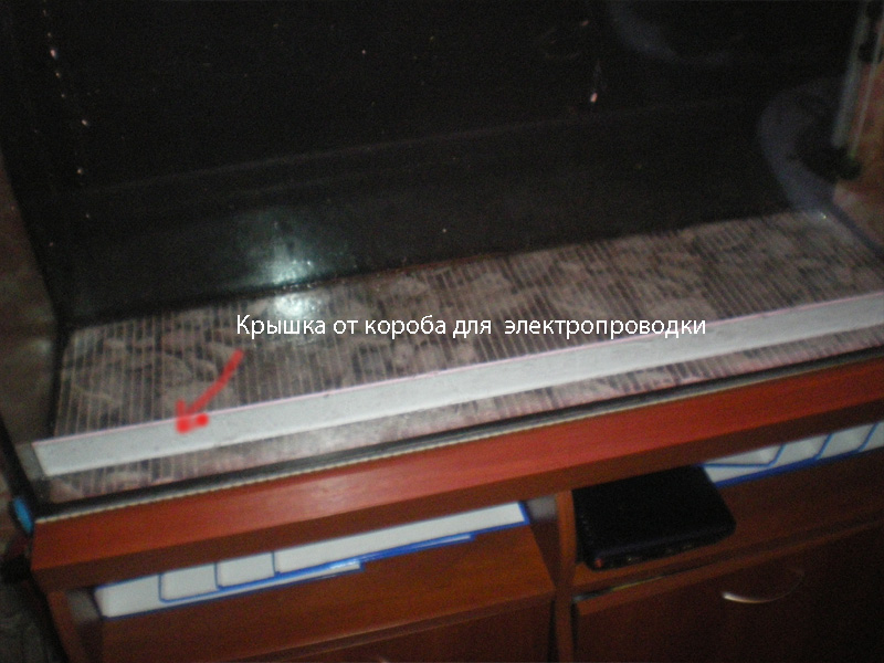 1) Всех рыбософ и растючку перекинул в таз. Установил перегородку вырезанную из крышки короба для прокладки электропроводки.Если хотите чтоб не было видно слоистости (вермикулит белый и не особо будет смотрется