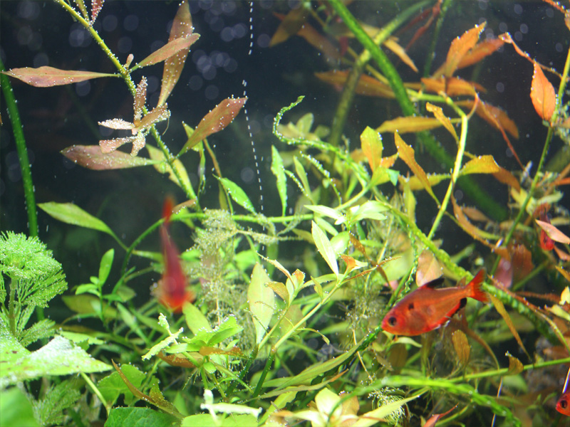 Плюсы устранил ксенонококус( затенил риччией на неделю),стелатус превратился в материнское растение с воздушной формой около 10см толщина стебля 1.5см получил 10 деток, вода кристально чистая ,лудвигия ползучая практически вся красная, произвел первую большую прополку половину продал и половину растений раздал. пузырят растения просто как дождь.
