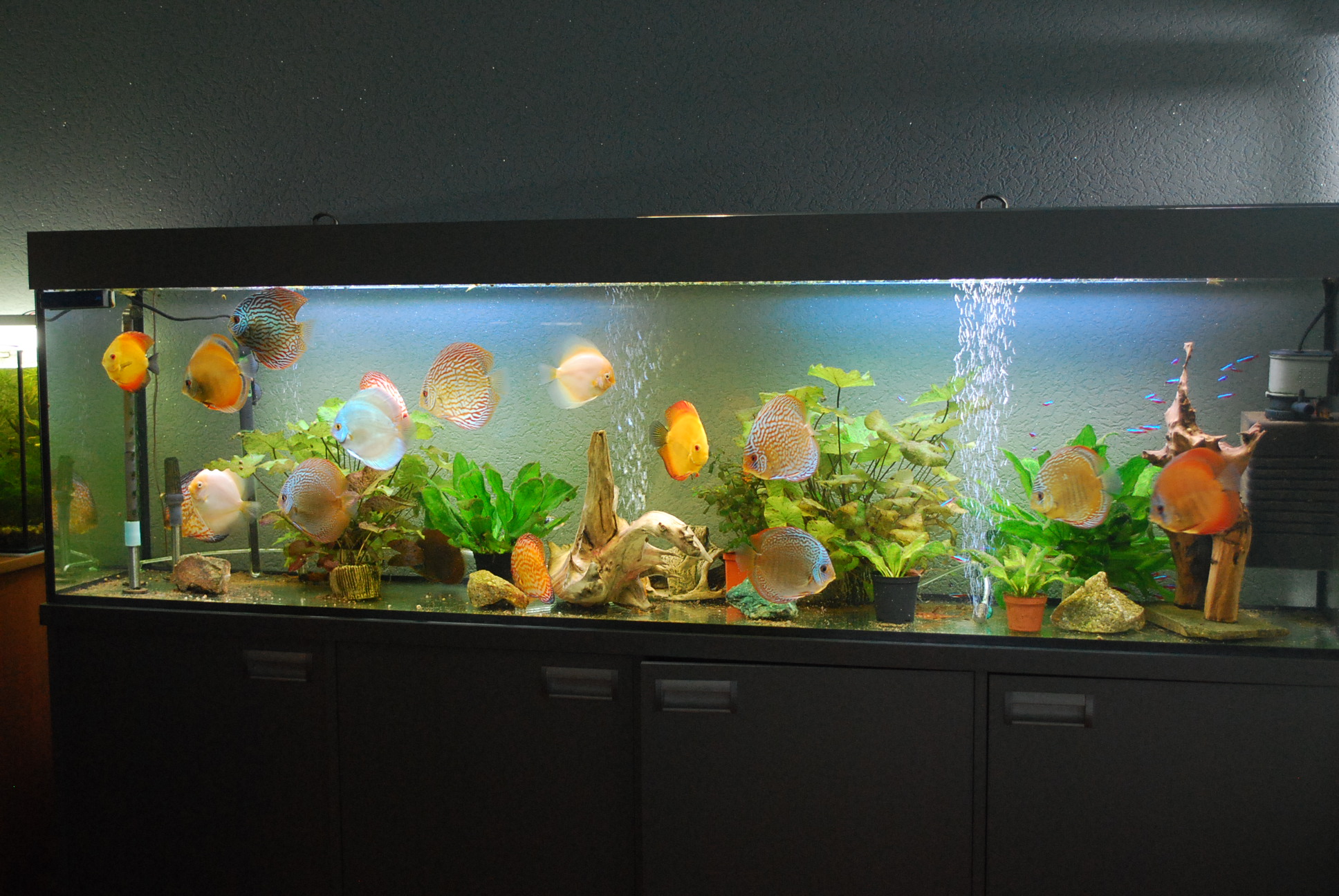 Сейчас засыпал грунт, кинул коряжку, кинул 12 мальков дискусят месяц назад. Пока растут.