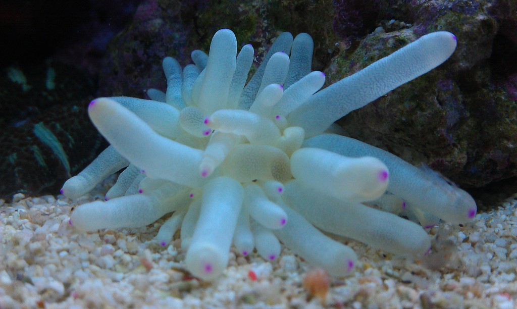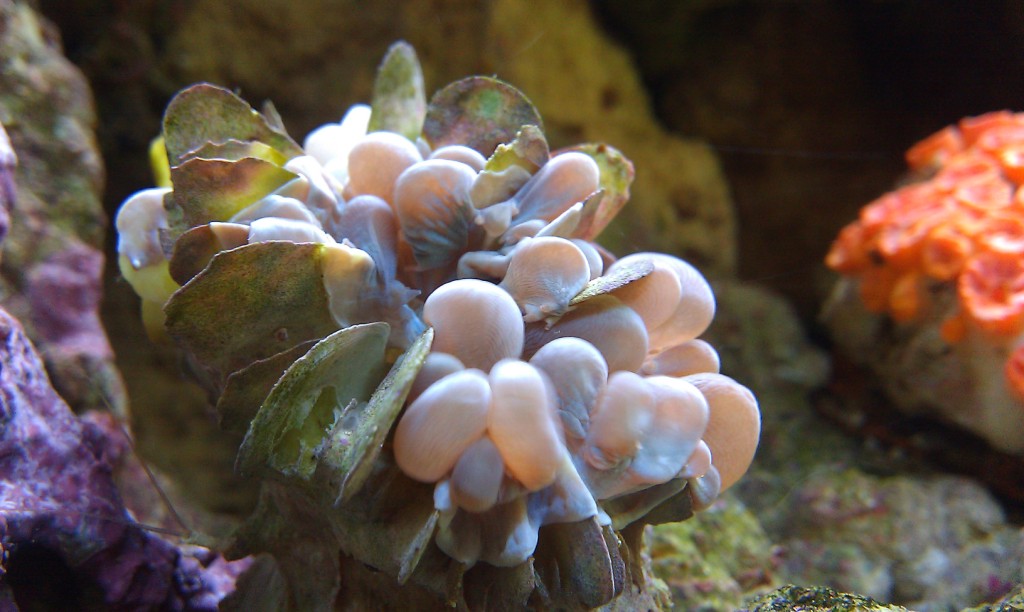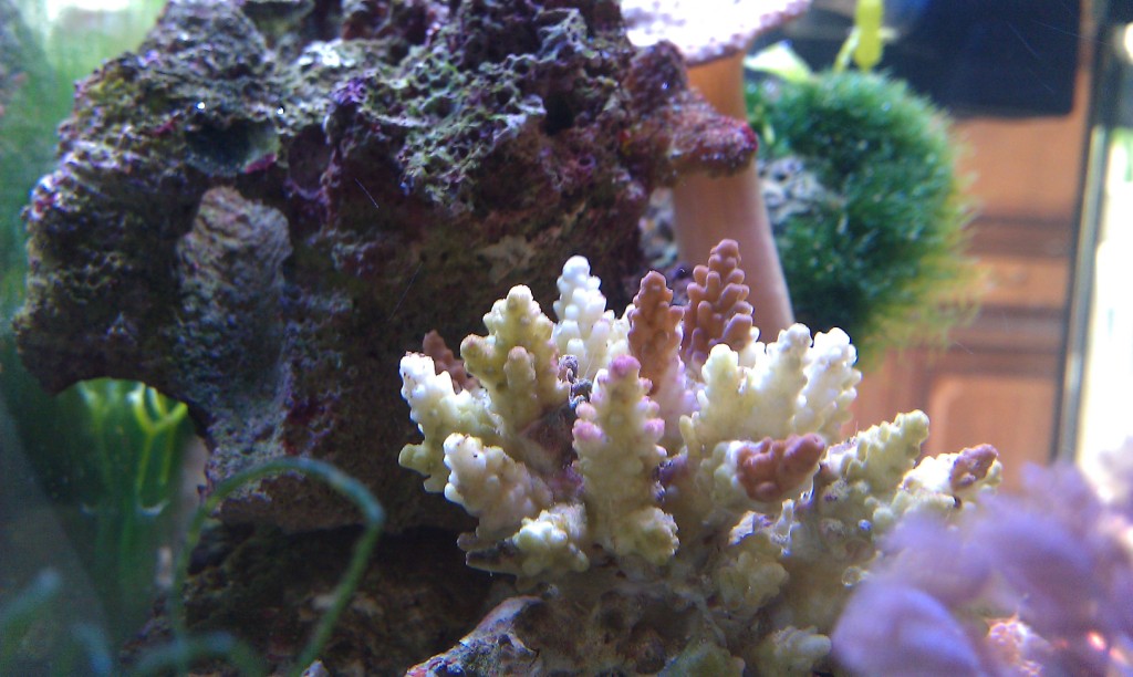 Акрапора-она сейчас белая,и чуток растет-это я засек....на некоторых ветка,в местах "спор-полипов" начала краснеть....Правда некоторые веточки коричневые-изначально были белые...Но сейчас снова белеет.Покраснение началось дня 2-3 назад...