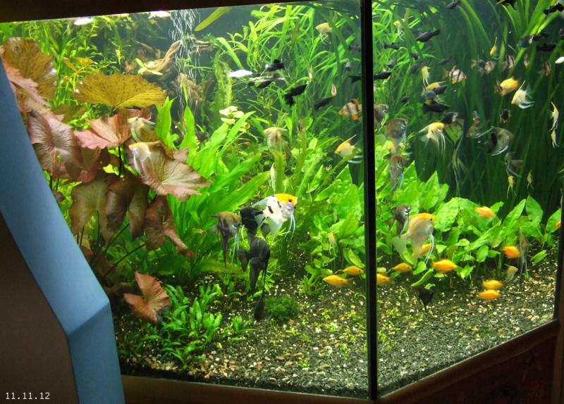 Так как перезагрузка у меня заняла почти две недели (еще и горячую воду отключили), то много растений погибло  а некоторые которые вы видите приходят в себя сейчас. Нимфея побрасывала листья, но выпустила много новых, некоторые эхи покрутили листья, но выпускают сейчас новые прямые листочки. Вобщем наращиваем сново массу растений. Рыбы так много (особенно скалярий) так как это рыба уже моего разведения, собираюсь тут на форуме раздавать/продавать.